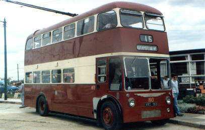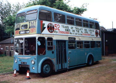 On 17th March 1965 it was decided to abandon the Caversham Bridge section as soon as possible because patronage on the trolleybuses was very light, there were three other motorbus services serving the road and the service only operated weekdays until 7.30pm anyway. The last day of operation on this section came on 10th July 1965. Also at this time the routing of services to the Stations was altered in preparation for a one way system in the town centre with new wiring being erected. In 1965 the virtual sole supplier of trolleybus cables gave a statement to all trolleybus operators that because of diminishing orders it was becoming difficult to manufacture stocks in economical quantities. Later in the year it announced it's intention to cease production altogether by the end of the year. At the same time Reading's Trolleybuses started to receive some bad publicity in the press because they cost more to operate compared to motorbuses and they were so inflexible. (These articles failed to mention however that the trolleybuses made a profit, and motorbuses a loss in the last financial year, and that trolleybuses were much faster, cheaper to purchase and maintain, and less polluting.) At the Council meeting on 26th July 1966 the chairman of the transport committee had to propose his committee's decision to abandon the trolleybus system (even though he did not agree). The full Council voted in favour of the proposal, meaning that an end to trolleybus operation in Reading was in sight. It was decided at the Transport Committee meeting on 28th September 1966 that the Whitley Wood trolleybus service should be abandoned no later than on the 1st January 1967. Roadworks were currently underway near the terminus in Whitley Wood, and the turning arrangements would need to be altered if there was any further delay in the abandonment of this section. Also the new Inner Distribution Road being built outside the Mill Lane depot would seriously affect the operation of trolleybuses between St.Mary's Butts and Stations. So, to avoid any unnecessary expenditure in construction it was decided that the Whitley line should be first to go, now that abandonment was certain. The withdrawal of eight of the BUT trolleybuses (not in fleet number sequence) took place in December 1966 and January 1967. The last day for the Stations - Whitley Wood section came on Sunday 8th January 1967. In June 1967 a purchase of 28 Bristol RE motorbus chassis was made to replace the final trolleybuses (see Former Vehicle Fleet List). In August Pennine bodywork was ordered for them. As they started to arrive in December 1967 the final day of regular operation came for the Northumberland Avenue section on Sunday 17th December 1967. The following day motorbuses were substituted on all but two morning peak extra duties which remained scheduled for trolleybus operation (in reality only one of those ran), but the line was left intact in case of any problems with the pre-Christmas rush. In fact only two days after the closure something did happen, a trolleybus was substituted for a motorbus due a shortage of motorbuses! This led to a decision to re-instate trolleybuses from 19th December on three afternoon duties. Eventually Friday 22nd December turned out to be the last day of trolleybus operation on the route to any noticeable degree, but the last service trolleybus to actually use the route was on 29th December 1967. The terminus was used for the last time on Sunday 30th December 1967 for a tour of the whole system by the National Trolleybus Society. The next route for conversion was the 18, conversion originally being planned for 17th March 1968, but was advanced by two weeks to coincide with the conversion of former trolleybus route 15 to one-man single-deck operation. This meant that the double deck Dennis Loline motorbuses could be used on service 18. The last day was on Sunday 3rd March 1968. The turning circle at Cemetery junction was used for the last time on 17th February 1968. This then left only the main line, route 17, being scheduled for abandonment in the summer of 1968 on arrival of the 28 Pennine-bodies Bristol REs. Following the closure of route 18, 6 BUTs were withdrawn. Delivery of the 28 REs started in March 1968, and 14 were expected by May/June. The first contraflow bus lane in Britain was introduced on 16th June 1968 when Kings Road became one way eastbound. It generated great interest, and a special video was made explaining it. The contraflow lane survived almost 20 years, until 22nd June 1988 when the road became two way again, but the lane still remains as a bus lane. The final day of operation of route 17 came on Sunday 3rd November 1968, the final trolleybus in normal service was 182 with 185 arriving just in front after a duel at the traffic lights when the buses met in town coming from opposite ends of the route. After this, 144, the final trolleybus carried a party of guests and invited VIPs on the final run to Tilehurst. It was led by 174 and 181, the guests were loaded aboard 144 and 181 and 174 acted as relief, spare seats being made available to enthusiasts just before moving off. Huge crowds lined the streets and a large crowd was at Mill Lane to see the final bus turn into the depot. Following this the Mayor pulled the switch in the depot sub-station cutting the power to the overhead wires. By midnight all the trolleybuses had been towed away from the depot to Bennet Road, 185 being the last to leave. The very last trolleybus then to leave Bennet Road was 188 on 11th May 1969. Of the vehicles operated by Reading 113, 144, 174, 181, 186 (in Teesside livery) and 193 are in preservation (see Former Vehicle Fleet List). They represent each type of Trolleybus operated by the undertaking apart from the original six 'test' vehicles. Below are some photographs of these vehicles: Here is preserved AEC 113 in October 1998 on the newly pedestrianised Broad Street. Preserved 113 in action at the Sandtoft Transport 